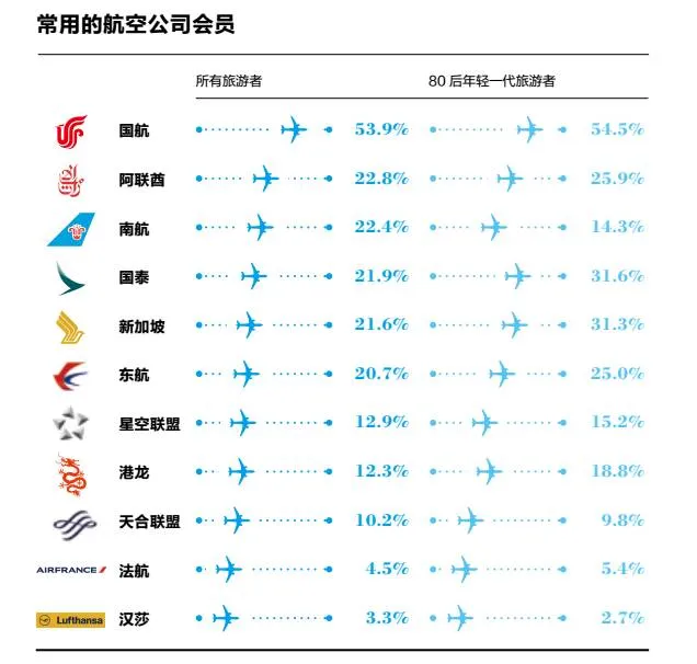 61%选择商务舱或头等舱。去年印象最深的一次出国旅行,61%受访者选择了商务舱或头等舱。在常用的航空公司会员的选择上,国航以绝对优势(54%)排名第一,其次是南航(22.4%)和国泰(21.9%)。国航已经连续三年占比超过50%。国外航空公司中,阿联酋航空和新加坡航空分别以23%和22%甩开其他竞争对手一大截。