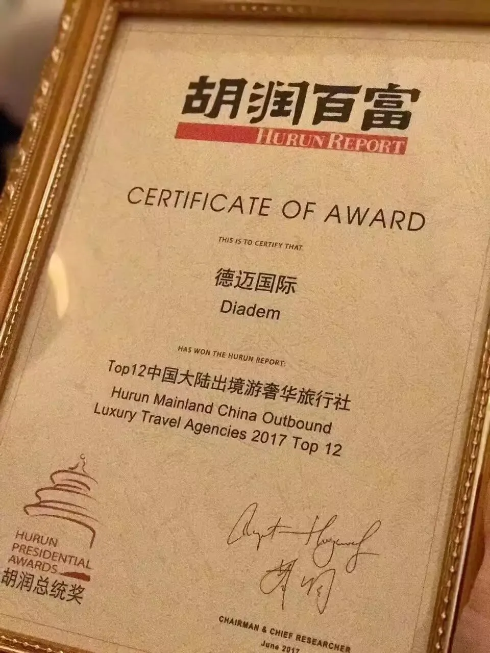 德迈国际旅行机构被评为“胡润中国大陆出境游奢华旅行社Top 12”,连续4年获得“胡润总统奖”。