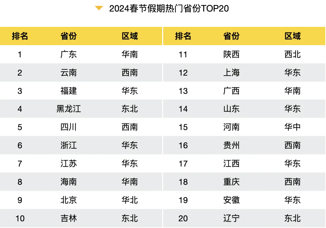 春节热门省份:广东、云南、福建