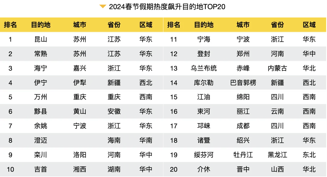 数据显示,2024年春节假期热度飙升的“小众目的地”有昆山、常熟、海宁、伊宁、万州、黟县、余姚、澄迈、栾川、吉首、宁海、登封、乌兰布统、库尔勒、江油、束河、邛崃、诸暨、绥芬河、介休等,越来越多的旅行者被“人少景美”的小众目的地吸引。