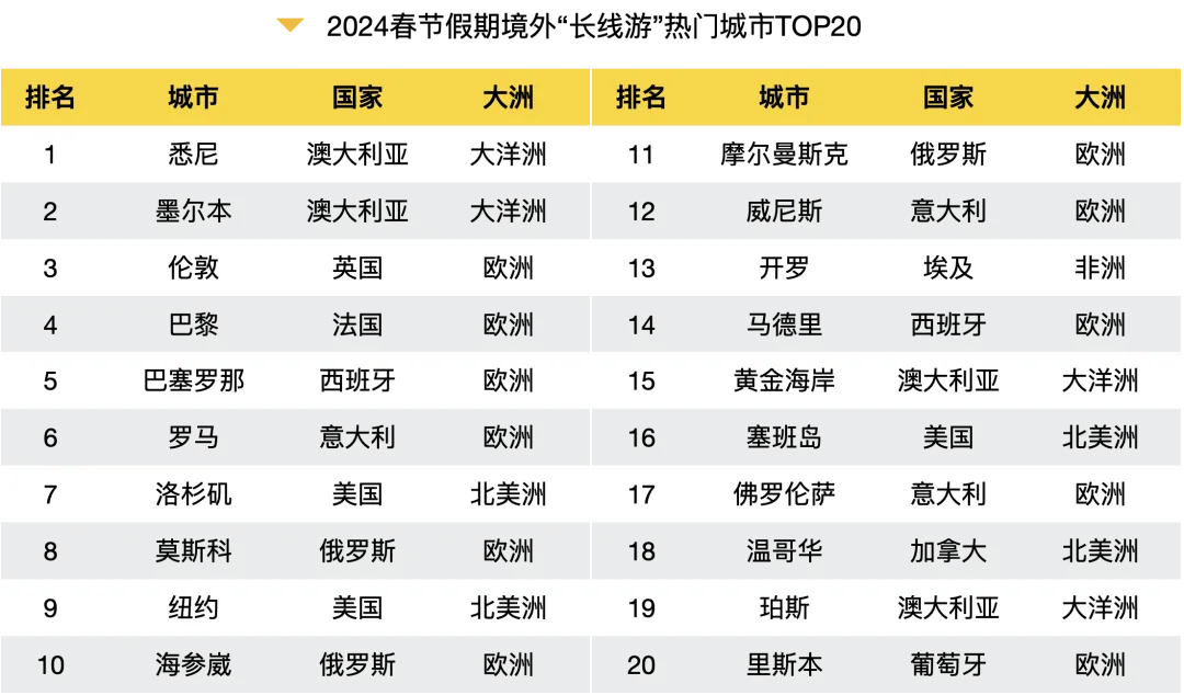 今年春节假期,境外“长线游”热门城市TOP10分别是悉尼、墨尔本、伦敦、巴黎、巴塞罗那、罗马、洛杉矶、莫斯科、纽约、海参崴。其中,旅行者在悉尼搜索最多的玩法词是“鲸鱼”、“浮潜”、“游船”。悉尼热度最高的景点有悉尼歌剧院、塔龙加动物园、邦迪海滩、达令港、悉尼鱼市场等。