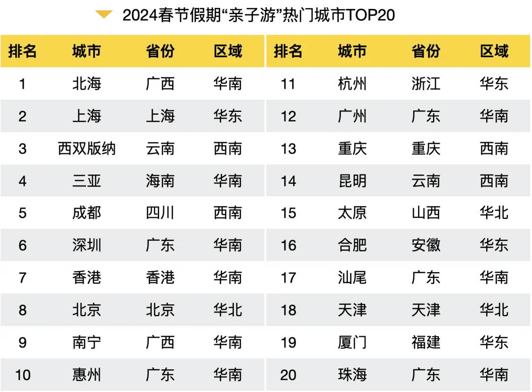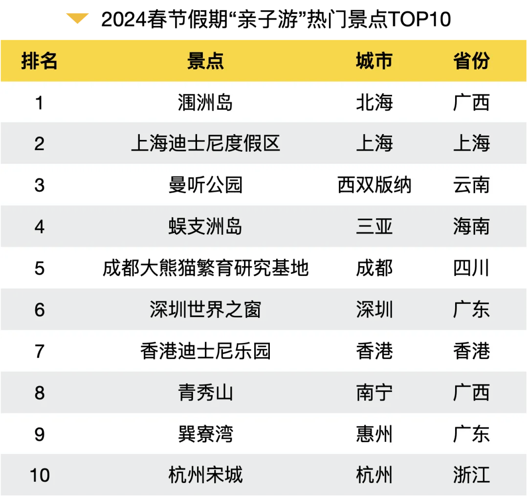 随着春节假期的到来,亲子研学游热度暴涨,年轻家长们正热衷于打造充满乐趣和知识的假期体验,让孩子们在欢笑声中学习新知,增长见识。数据显示,2024春节假期“亲子游”热门城市是北海、上海、西双版纳、三亚、成都、深圳等。“亲子游”景点排名靠前的是涠洲岛、上海迪士尼度假区、曼听公园、蜈支洲岛、成都大熊猫繁育研究基地、深圳世界之窗等。