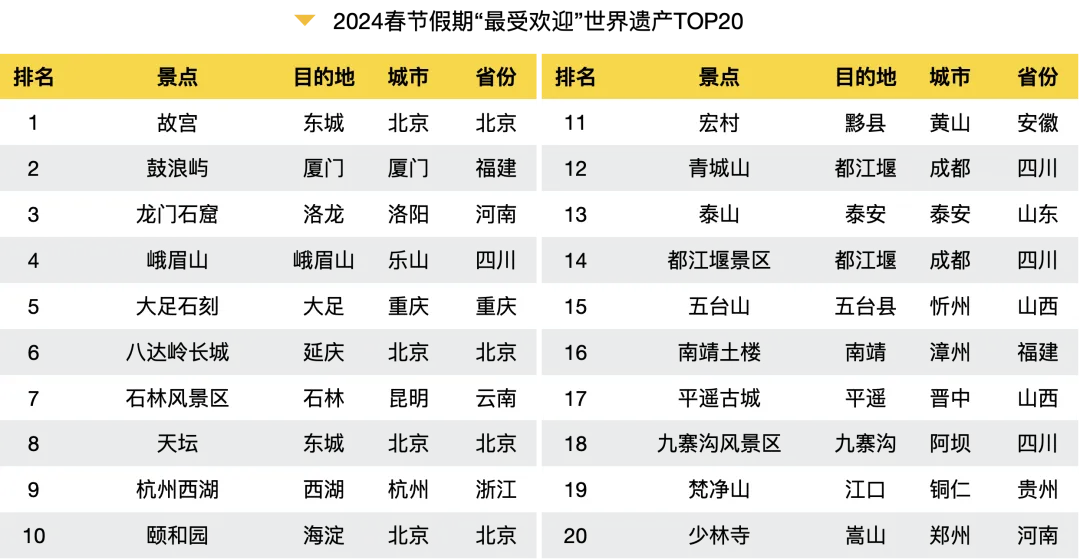 今年春节,旅游爱好者们纷纷踏上寻找历史与自然美景交织的旅程,将世界遗产地作为他们的目的地清单。数据显示,2024春节假期“最受欢迎”世界遗产是故宫、鼓浪屿、龙门石窟、峨眉山、大足石刻、八达岭长城、石林风景区、天坛、杭州西湖、颐和园。