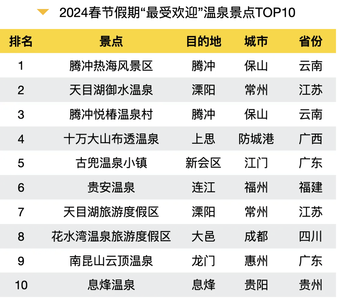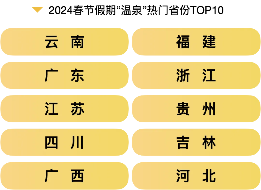 数据显示,泡温泉成为了一种简单有效的休闲方式,让人们在享受自然美景的同时,也能得到身心的彻底放松。特别是在寒冷的冬季,温泉旅游更是成为了追求健康和休闲生活人士的热门选择。2024春节假期“温泉”环比搜索增长201%,热门省份TOP10为云南、广东、江苏、四川、广西、福建、浙江、贵州、吉林、河北。其中,最受欢迎的温泉景点有腾冲热海风景区、天目湖御水温泉、腾冲悦椿温泉村、十万大山布透温泉、古兜温泉小镇等。