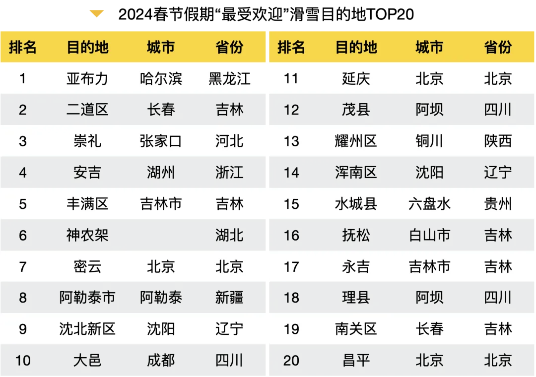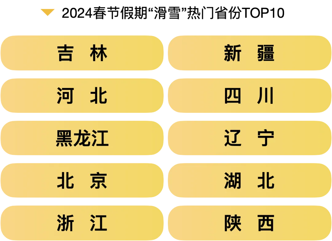 2024春节假期“滑雪”热度飙升,环比搜索增长207%,热门省份TOP10为吉林、河北、黑龙江、北京、浙江、新疆、四川、辽宁、湖北和陕西。其中,黑龙江亚布力、吉林二道区、河北崇礼、浙江安吉等地以其优质的雪质、完善的设施和独特的滑雪体验,成为滑雪爱好者追寻冬日乐趣的首选目的地。