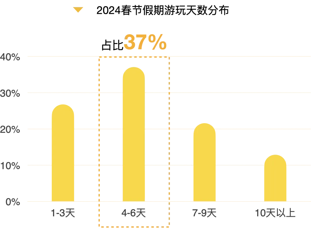 2024年春节假期,“家庭亲子人群”占比45%,突显了节日家庭团圆的传统。朋友同游也颇受欢迎,占比26%,彰显了社交旅行的魅力,此外,独自旅游人群占比18%,情侣出游占比11%。值得注意的是,长途旅行的热情在春节期间显著升温,超过七成的游客选择游玩4天以上,这反映出旅行者追求更丰富、更深度的旅行体验,且愿意为此投入更多时间。