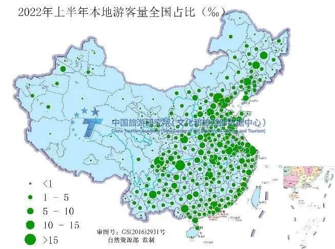 上半年总游客量空间上呈现“两点一线”的分布特征,“一线”是长江流域沿线,包括成都、重庆、武汉、上海等地总游客量占比高,“两点”是北京和广州。总游客量的分布特征由本地游客量和流入游客量共同形成,其中本地游客量以上海、郑州、北京之间的三角形区域分布最为集中,该地区人口密集,疫情管控使得本地化出游居多,而流入游客量以多个单点城市优势明显为特征。