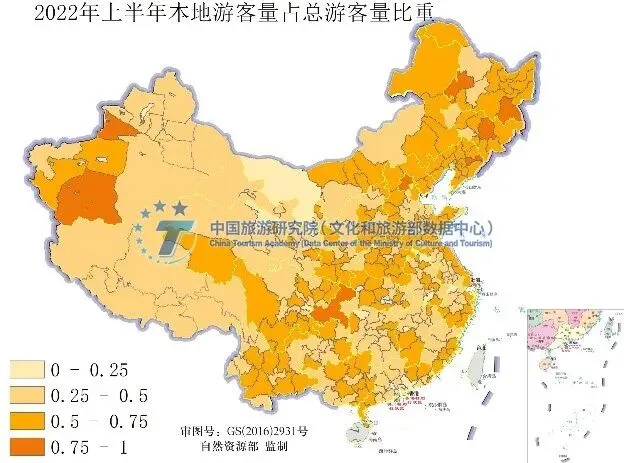 与2021年同期相比,2022年上半年本地游客量减少比外地游客量减少多8%,本地游客量占比仍高于外地游客量占比。疫情期间,外地游客量整体收缩明显,基数不高,与去年对比上半年外地游客量下降幅度相对更小。6月旅游热度回升,游客城市客流总量恢复至去年同期的60%左右,东部地区总体恢复情况好于西部地区。2022年上半年本地游客量占比减少14.53%,本地游客占比较高的城市主要分布在东北、西南、华北和新疆西部等地区。