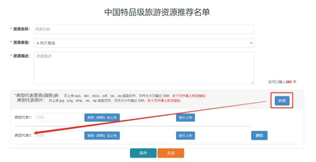 每项推荐资源由资源名称、资源描述两部分组成,同时填报资源描述中包含典型代表的普查信息。