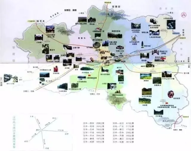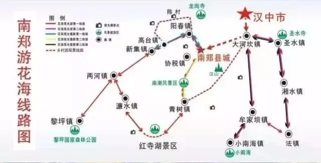 2、 南郑县城——阳春镇——陈村——高台镇(尖山沟)——新集镇——两河镇——濂水镇——黄官镇——红寺湖景区——南湖景区。