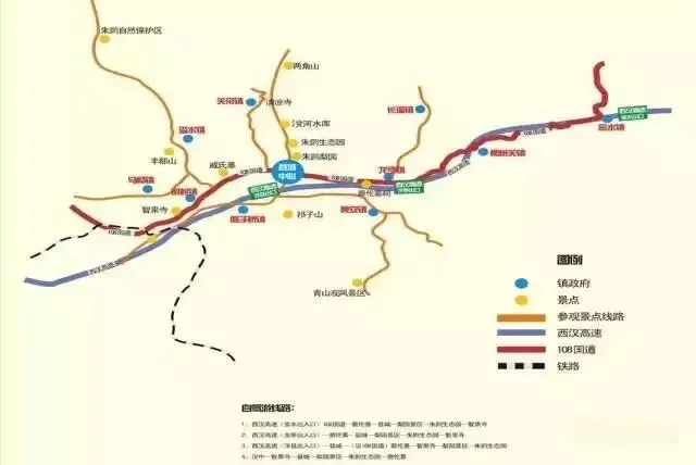 1.县城——梨园大道——托福牛广场——朱鹮梨园——农业观光园——朱鹮生态园。