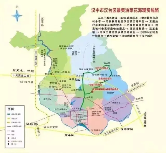 1.从汉中城区出发——沿汉武路北上——老君镇拐拐店村——王道池村最美油菜花海观赏点——毛堰村最佳拍摄点——徐望镇金家桥最佳拍摄点——汉王集镇——沿汉王镇至武乡公路西行——沙凹岭区域最佳拍摄点——武乡集镇——沿汉武路南行——汉中城区。