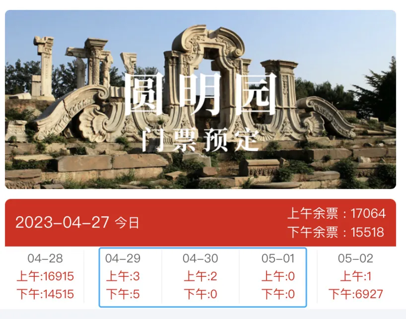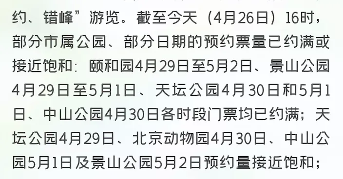 而像颐和园、圆明园、长城,甚至北京动物园,这样的户外景区都已经几乎买不到五一前三天的门票了。
