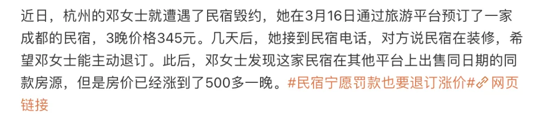 人潮未动,房价先涨 最先感知到五一拥挤的,是早早订好民宿,被房东和酒店毁约的人。 先是杭州的邓女士接到民宿电话,对方要求她主动退订3晚345元的房间,理由是民宿需要装修。
