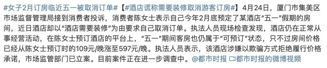 后来,厦门市集美区市场监督管理局接到了陈女士的投诉,酒店在以装修为由要求她取消订单后,房间价格从109涨到了597,是原价的五倍还多。