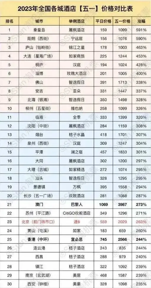 面对酒店毁约涨价带来的一系列问题,大部分人只能自认倒霉,退房重订。 当然,也有一部分人跟客服表示愿意接受“装修”带来的影响。他们一边对酒店展示强硬立场,另一边却也陷入担忧—— “到店后会不会因为拒绝退房,被安排到最差的房间,或者被拒绝入住?” “只能去了再说!” 根据某旅游平台数据,截至3月19日,“五一”期间酒店预订量已比去年增长了五十倍。 预订量的增长,不断拉高着酒店价格。 沈欣住在北京东四环,一年前她因为和男朋友吵架住进了北京兴隆郊野公园附近的某快捷酒店,每晚150块。 上个月,她帮来京的朋友订酒店时,发现房价已经涨到了249。当她把日期调到5月1日,这个价格赫然变成四位数——1200+。 这让她只能劝说原本打算来北京看她的父母错峰探亲。“实在是太贵了”。 这个五一,酒店涨价已成必然。从经济型到舒适型、高档型,再到豪华型,大部分酒店涨幅在2倍到3倍左右。 一张流传甚广的五一各城酒店价格对比表给出的数据,则更为直观——部分酒店的房价涨幅接近600%。