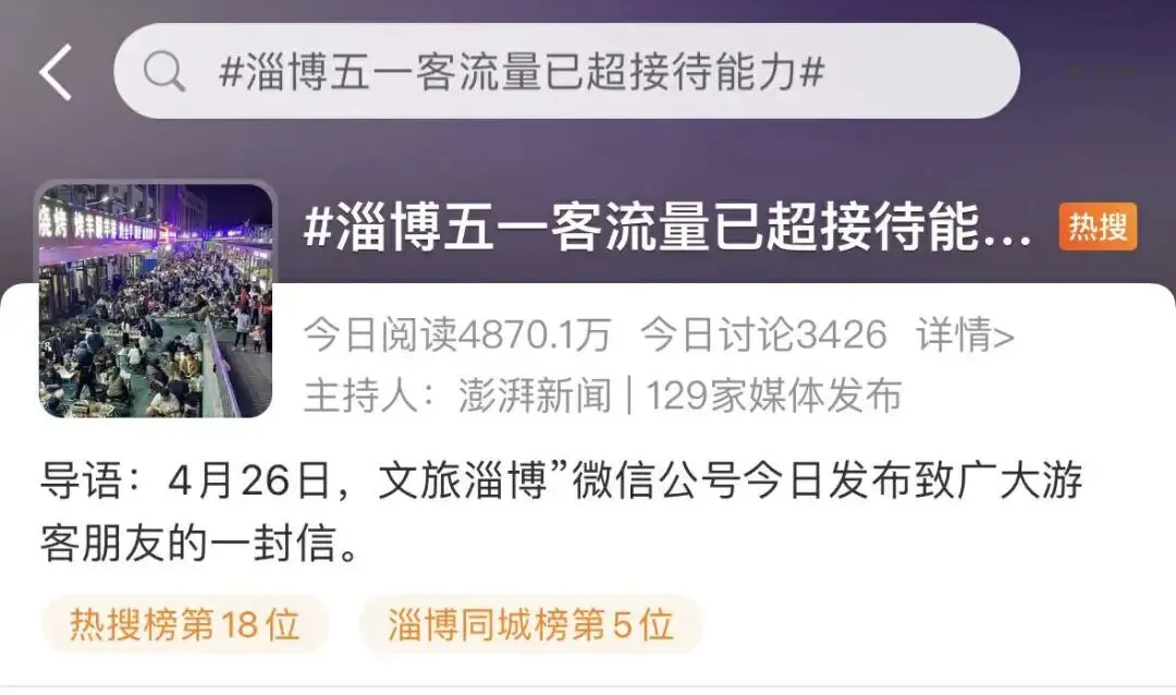 淄博文旅甚至发文称五一客流量已超接待能力,建议网友到其他城市游玩。