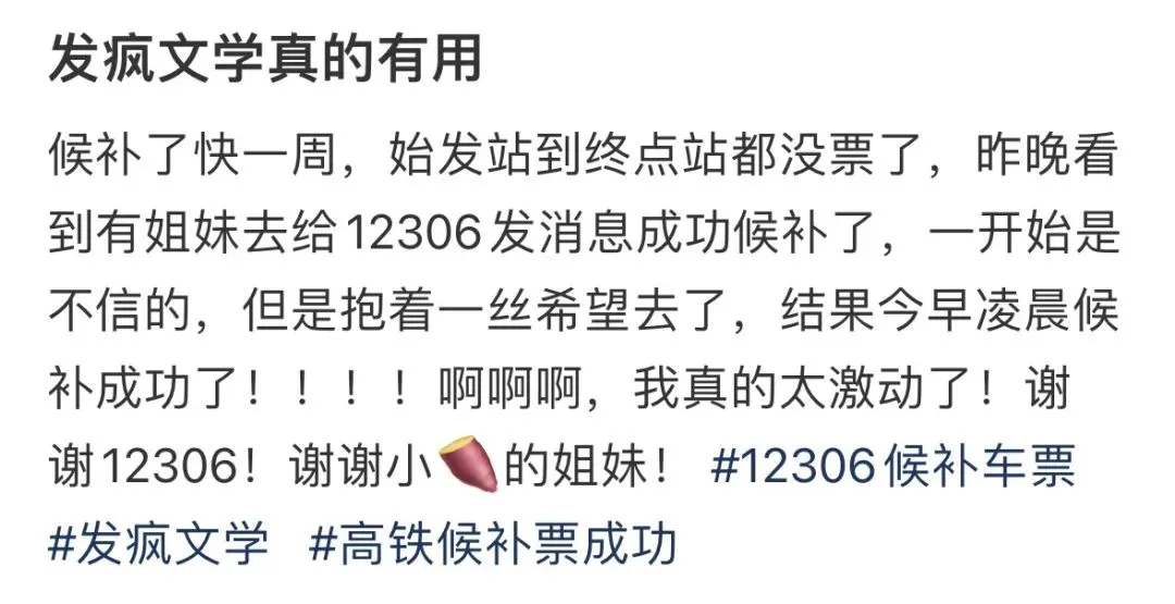 不过总有顺风车到不了的地方,抢不到票的网友开始在12306微信后台狂写“发疯文学”。