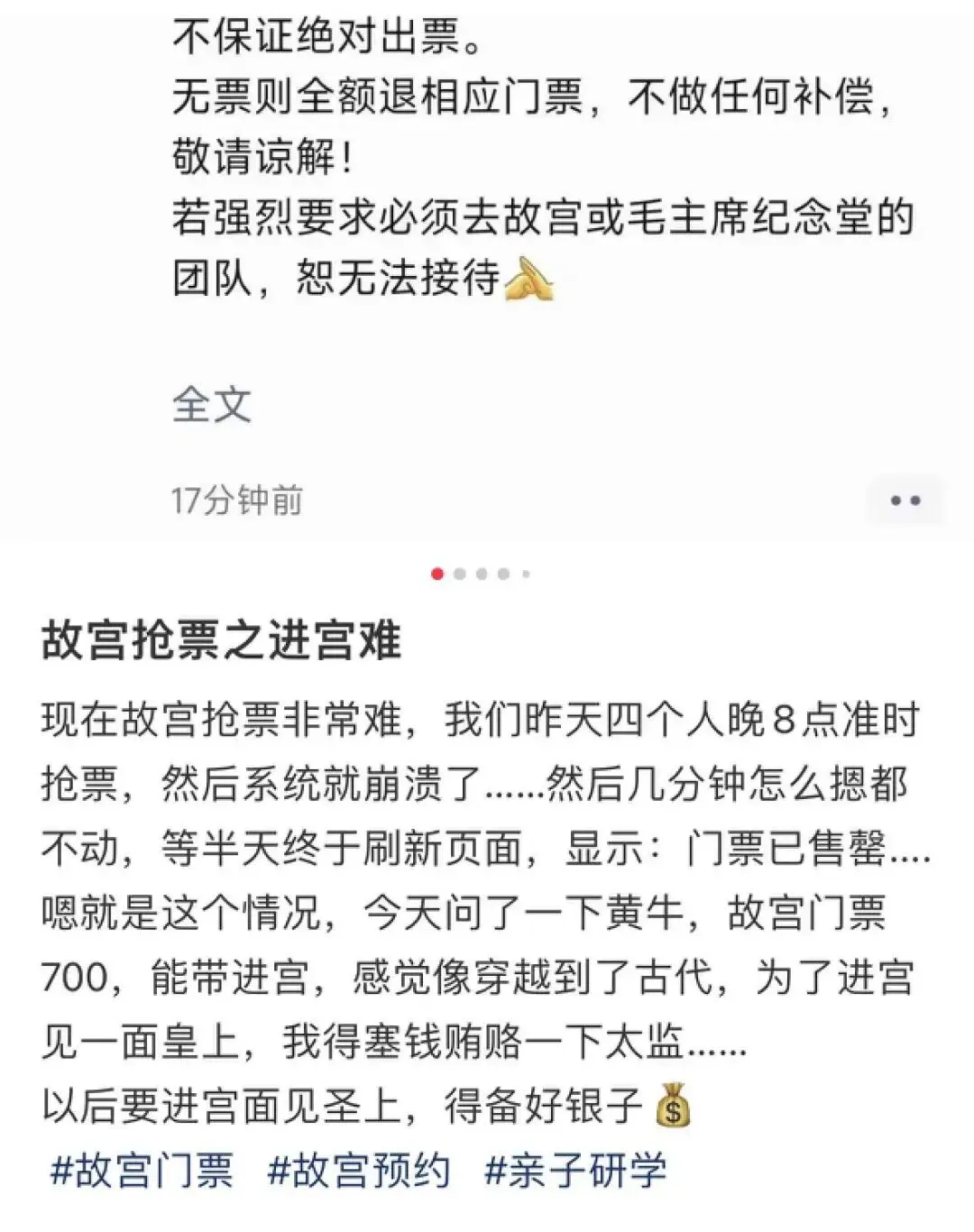 临近五一,反向旅游再次走红。 “别人去南京,你可以反向去镇江”; “杭州人太多,去滁州也精彩”; “西安太挤,不如去趟宝鸡”...... 根据今年五一期间全国车票发售数据,铁路主要到达城市有北京、广州、上海、成都、武汉、杭州、西安、南京、长沙、重庆。 但热门旅游城市,可真不是说想来就能来的,拼的不止手速、运气,还有“钞能力”。 想去故宫,抢不到票,700一张的黄牛票还不保证绝对出票。