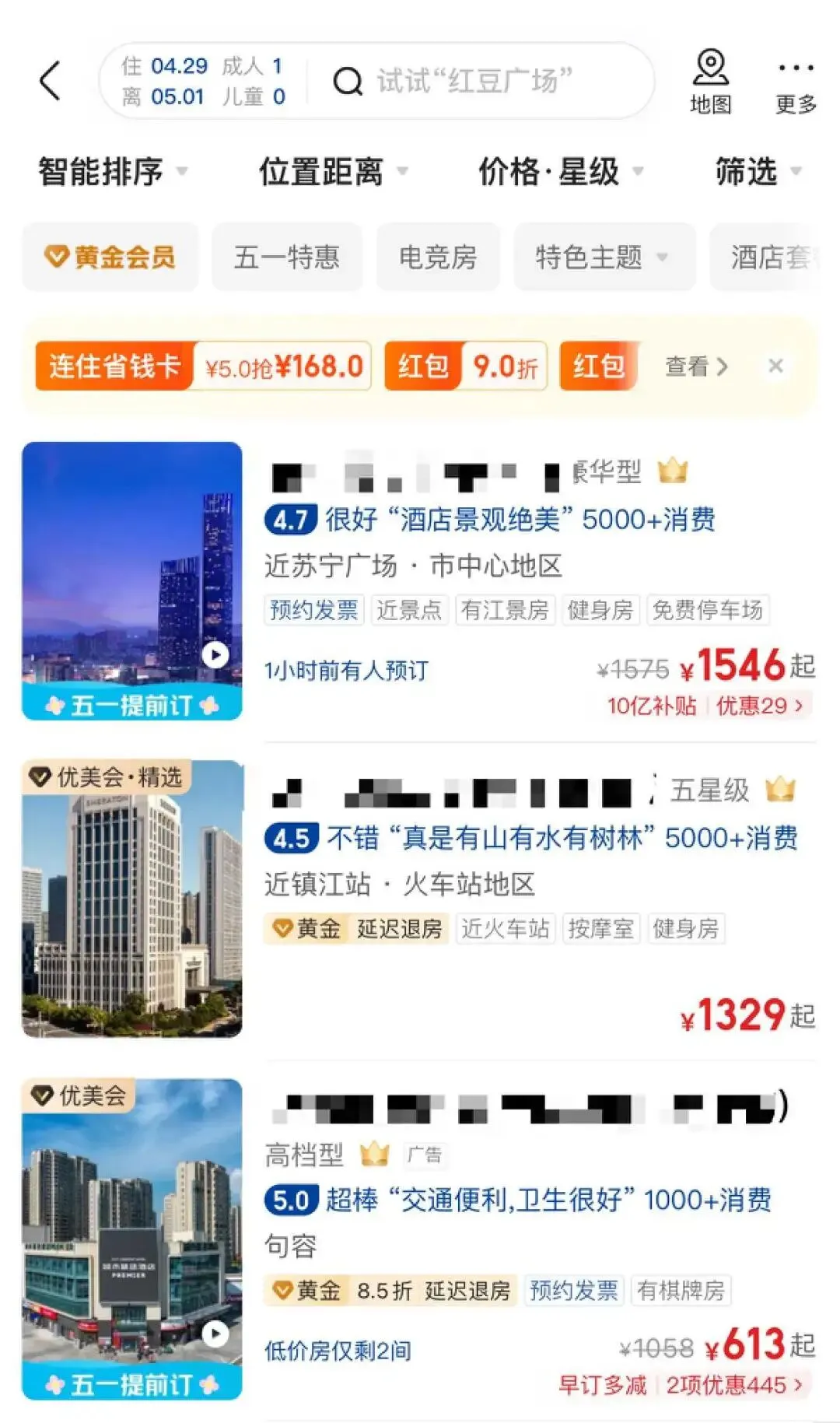 只一个热门景点,就要七百多门票,这是个经费燃烧的假期。 很显然,不是所有人都过得起这样的五一。 于是,反向旅游计划者们另辟蹊径,把目的地定在这些热门城市的周边地区。 某种程度上,它是热门平替,避开人流,用更少的时间和金钱感受与热门旅游城市相似的自然景观和人文环境。 但事实上,打开手机搜索“镇江”这个打了反向旅游 tag 的城市,首页推荐大多酒店一晚的价格依旧在600以上。