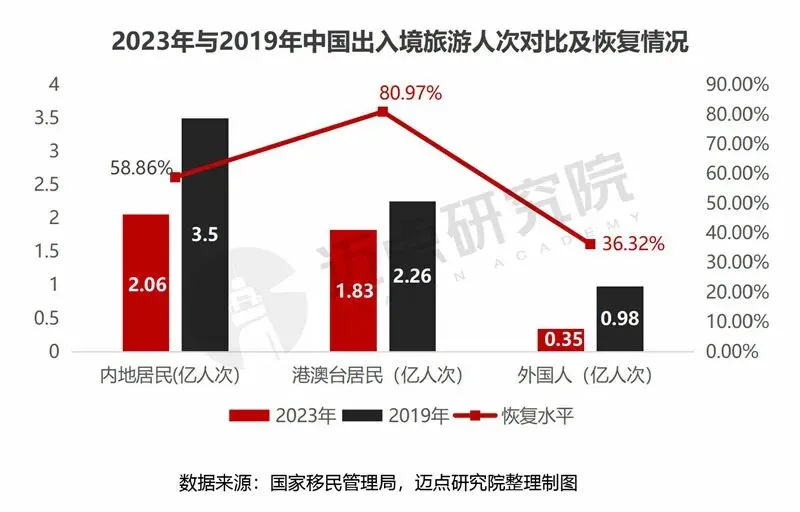 依据国家移民管理局公布数据,2023年全国出入境人员4.24亿人次,同比上升266.5%,恢复到2019年的67%;据中国旅游研究院发布的《2023年中国旅游经济运行分析与2024年发展预测》报告数据,2023年我国入出境旅游人数超过1.9亿人次,较去年增长2.8倍以上。具体细分出境游和入境游,又呈现不同的发展特点、面临不同的发展难题。