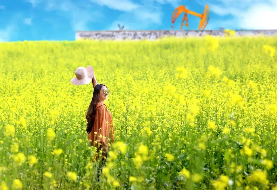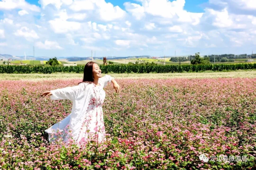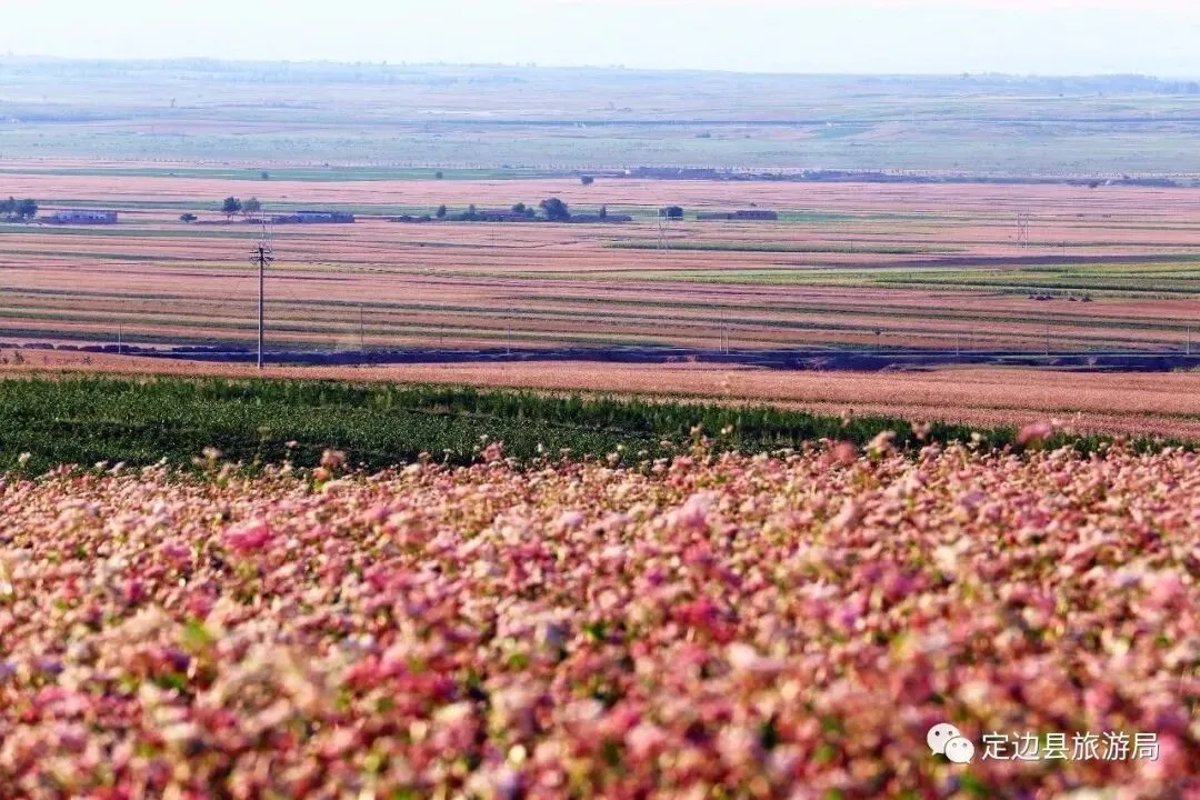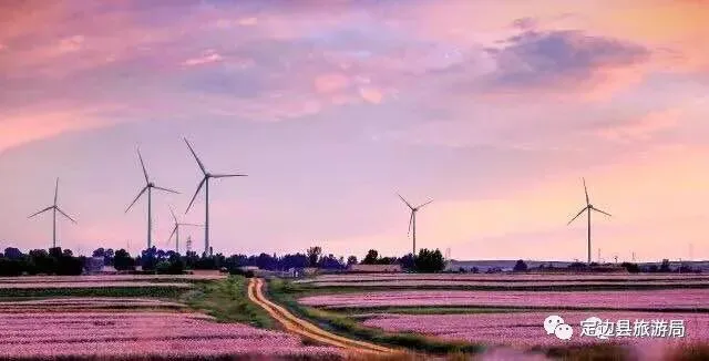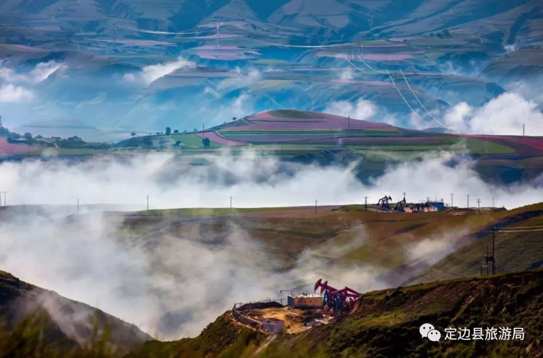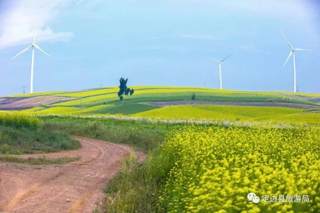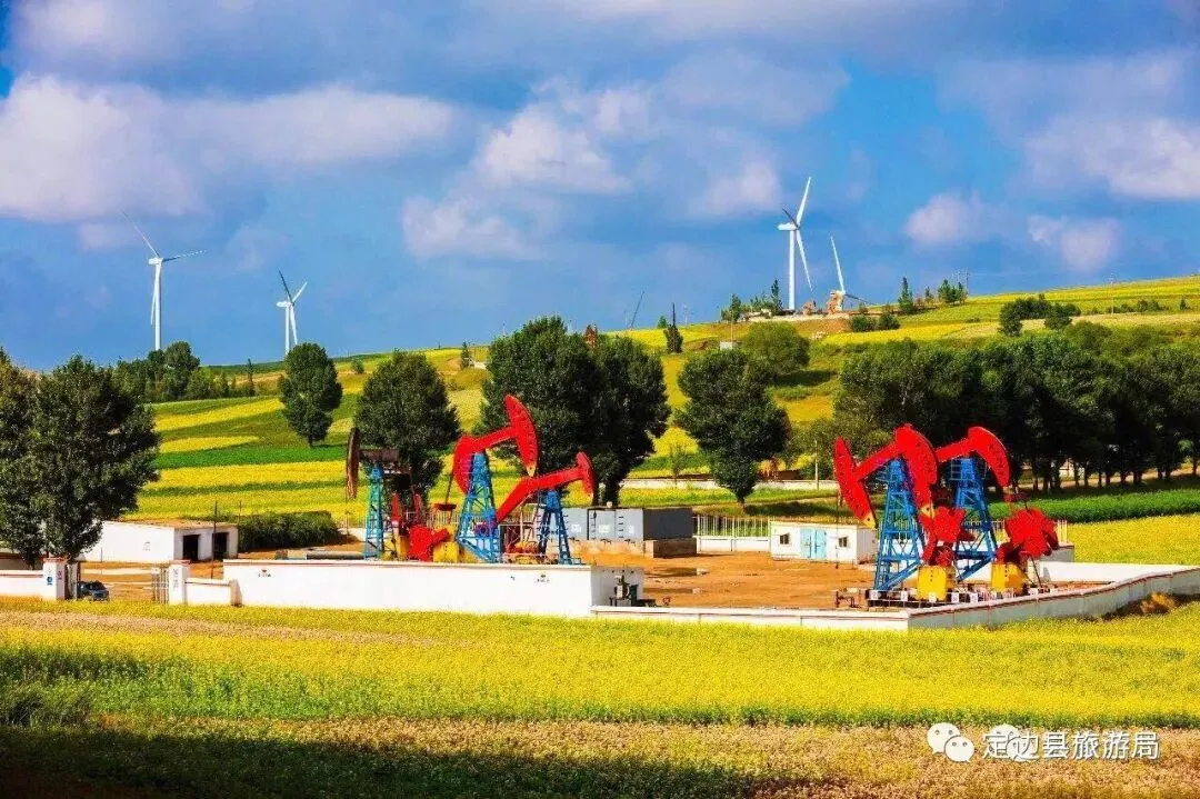 定边县白于山区每年8-10月,田园花海、蓝天白云、风车井架、丘陵沟壑、墩台烽燧,构成了一幅五彩缤纷、刚柔相济、层次分明的瑰丽画卷。荞麦花、洋芋花、黄芥花、向日葵争相绽放,随风摇曳,随处可见白色巨大风车群和红色成排油井,是独具定边特色的生态观光景区。