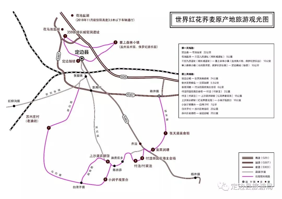 推荐线路:砖井镇张天渠村美食一条街→→→油房庄乡韭菜涧塘→→→油房庄乡付(家)洼村(世界红花荞麦原产地地标及主景观区)→→→油房庄乡陈峁峁观景台→→→纪畔上沙渠农耕展览馆→→→白湾子镇小涧子村观景台→→→贺圈苏兴庄村老油坊