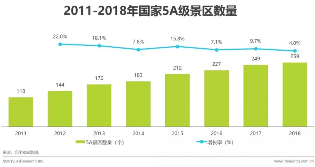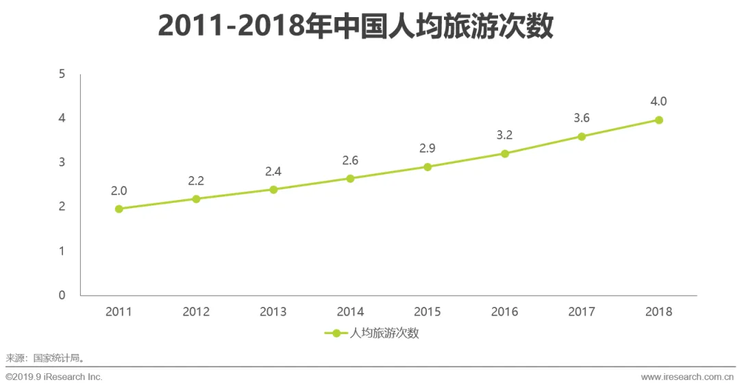 整体旅游市场:近年来我国国内旅游市场持续保持10%以上的高速增长,2018年全年国内旅游人数达55.4亿人次,比上年同期增长10.8%,一年人均出游4次,旅游渐成国民常态化消费,我国已进入大众旅游时代。