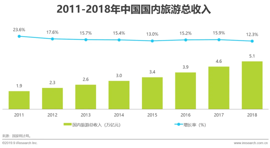 旅游人数的增加推动了旅游收入的增长。2018年国内旅游总收入达5.1万亿元,同期增长12.3%。随着国家对全域旅游、冰雪旅游、乡村旅游等旅游业态的持续深入推广,未来我国国内旅游总收入仍将保持增长态势。
