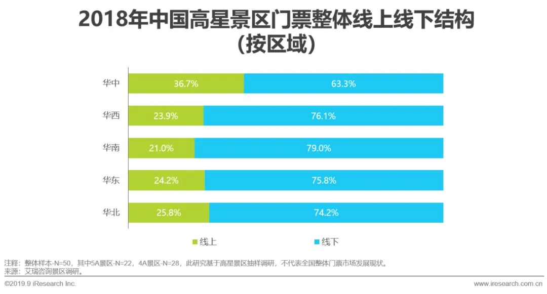 抽样调查数据显示,线下销售渠道是高星景区门票的主要销售渠道,占比达74.0%。分区域来看,华中区域景区门票线上占比最高。现阶段,高星景区门票仍旧以线下售票为主,未来随着互联网的不断渗透以及人们线上购买门票习惯的养成,线上门票销售占比将逐渐提高。