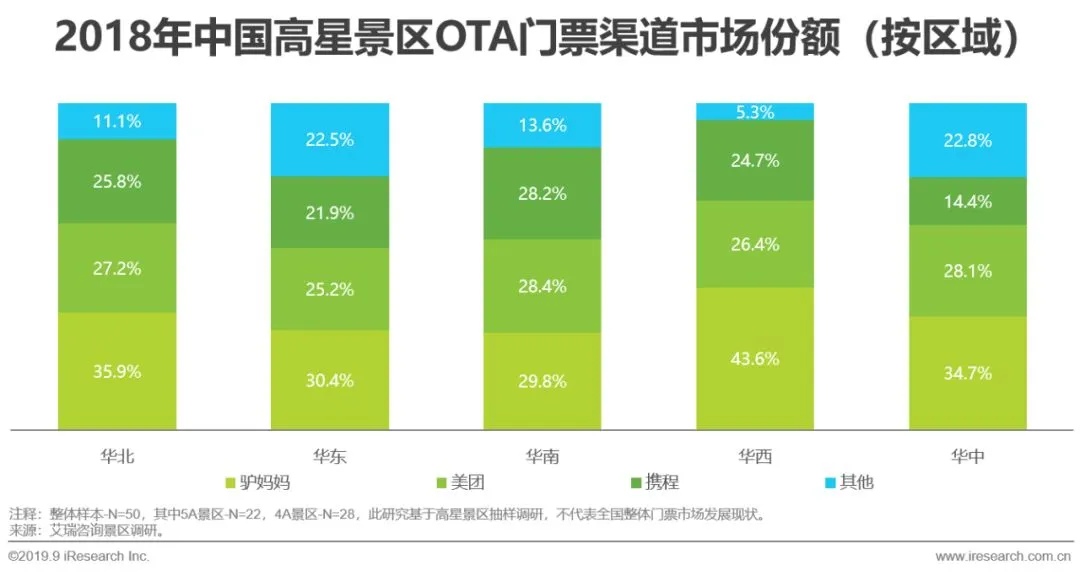 华北、华南、华西地区景区OTA门票渠道市场CR3超85%