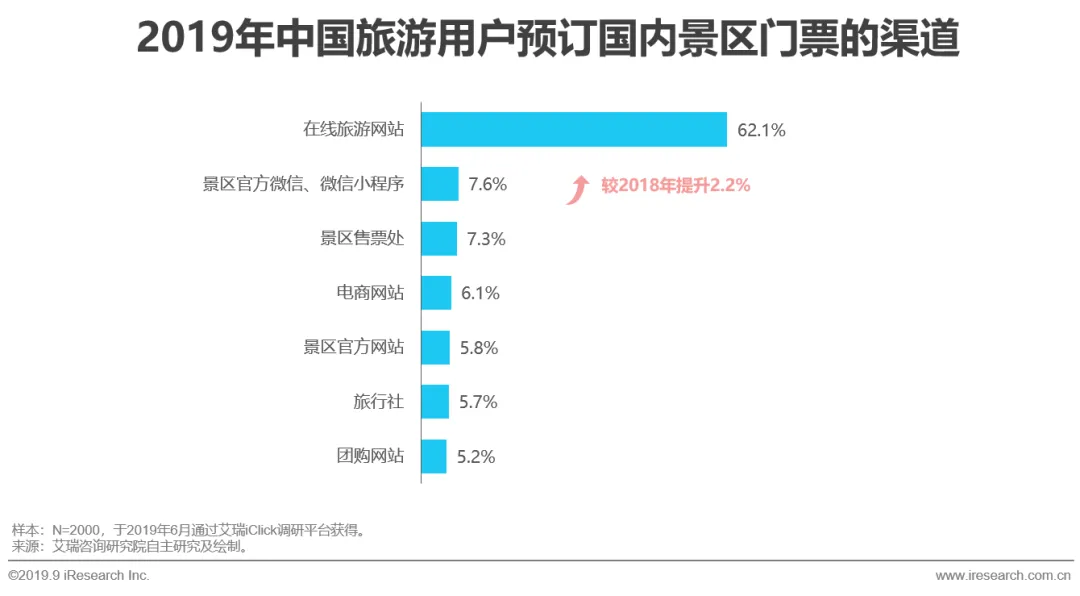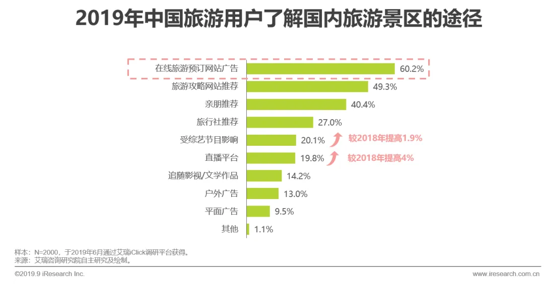 根据艾瑞用户调研,在线旅游网站(60.2%)和旅游攻略网站(49.3%)是用户了解国内旅游景区信息的主要渠道。随着媒体形式的快速变化,短视频、直播等愈发受到用户的欢迎,2019年通过直播平台了解旅游景区信息的用户较上一年增长了4.0%,通过综艺节目了解景区的用户较2018年增长了1.9%。