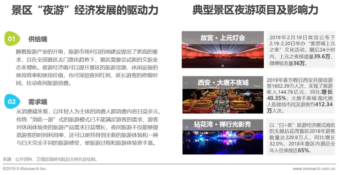 随着旅游产业的升级,旅游市场对旅游目的地建设提出了更高的要求。传统“到此一游”式的旅游模式已不能满足游客的需求,目的地需要更丰富的旅游产品和旅游吸引物来留住游客,在此背景下,“夜游”经济迅速崛起,艾瑞分析,夜游产品将成为景区发展的新蓝海,原因有两方面:一方面,从供给端来说,夜游经济既可以提高景区的旅游资源及休闲设备的使用效率和使用价值,也可深挖夜间红利,延长游客的停留时间;另一方面,从消费端来看,以年轻人为主体的消费人群消费内容日益多元,游客对休闲体验类的旅游产品需求日益增长,夜间旅游不仅能够提高游客的时间利用率,还可以使其得到全新的旅游体验,使旅游过程和旅游体验更丰富。