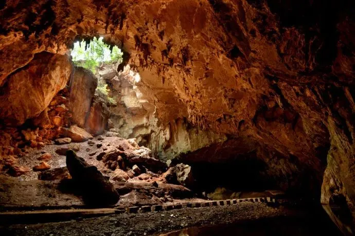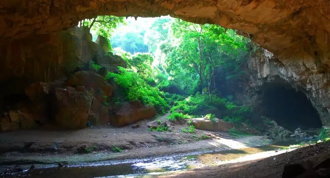 而更让人惊奇的是,洞口由于长期被暗河的流水冲刷、溶蚀,现在只剩下三根粗壮的山柱支撑,宛如一具三足鼎,想来这就是三脚洞之名的由来吧。