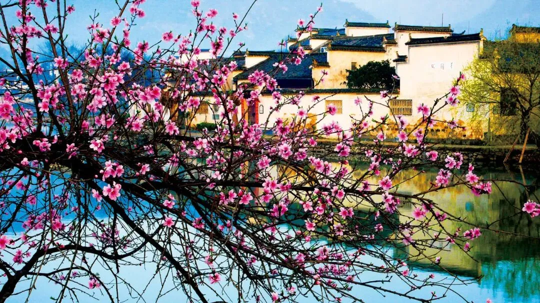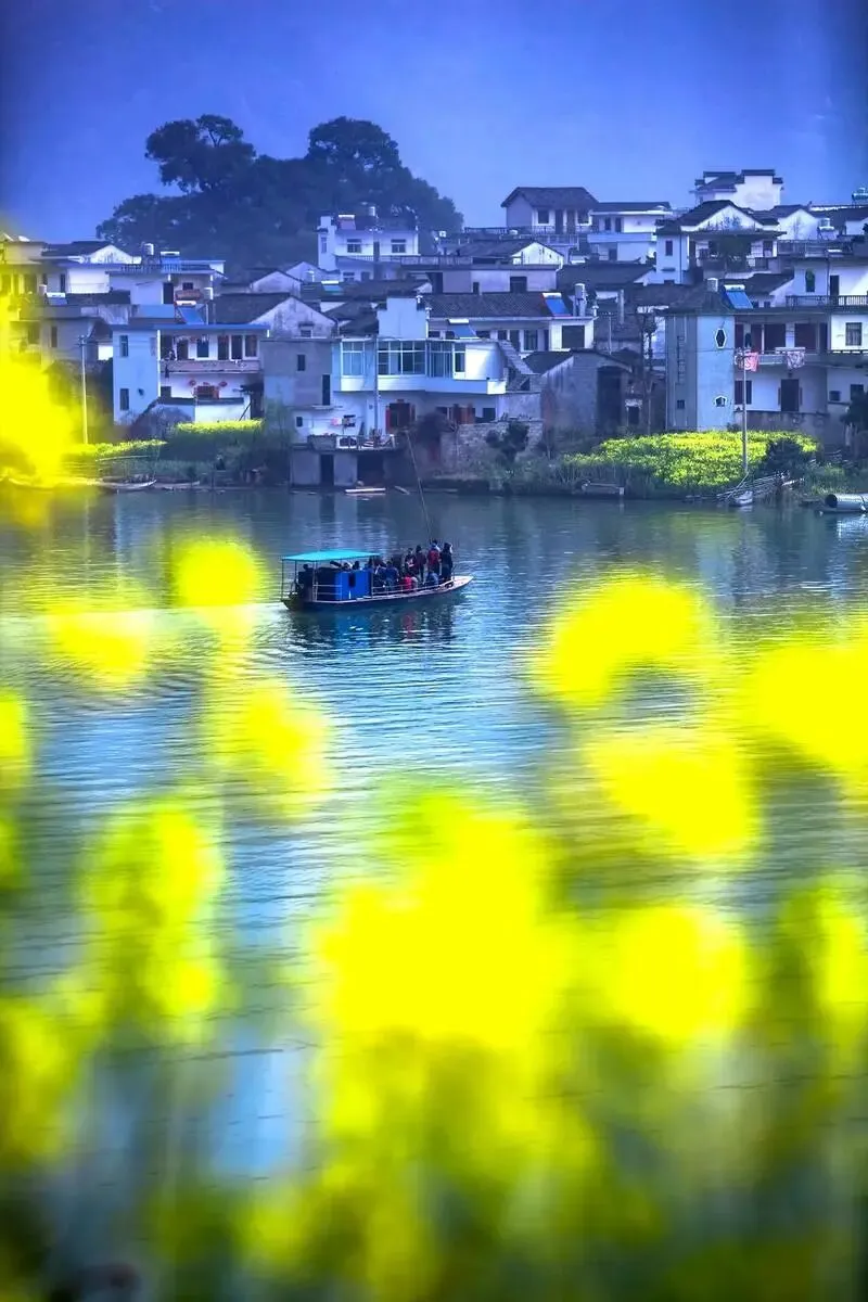 在白墙、黛瓦、马头墙在花海的簇拥下,显得格外宁静而富有诗意。乘船逆流而上,江风拂面,看两岸的繁花、古渡、渔舟从眼前缓缓掠过,真正体会到“人行明镜中,鸟度屏风里”的意境 。