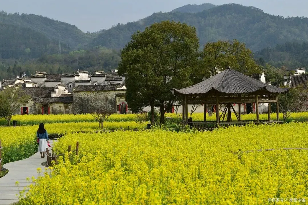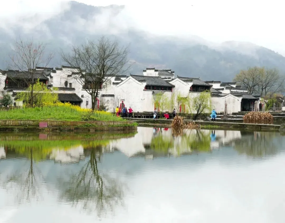 有着“江南第一村”美誉的呈坎,以其神秘的八卦布局闻名。而在春天,这个千年古村变得温柔起来。环绕村庄的永兴湖畔,大片油菜花盛开,明黄色的花海与平静如镜的湖面、粉墙黛瓦的古建筑倒影融为一体 。