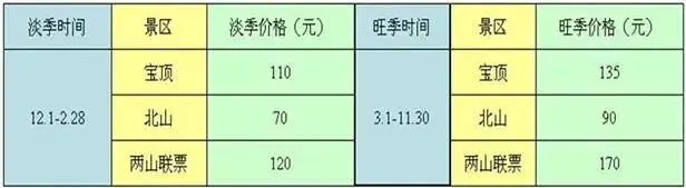 ○峨眉山:旺季时的进山门票是185元,从12月15日至次年1月15日则降为110元,同时金顶索道、万年索道的往返票价也从旺季时的120元、110元统一降为50元。
