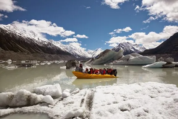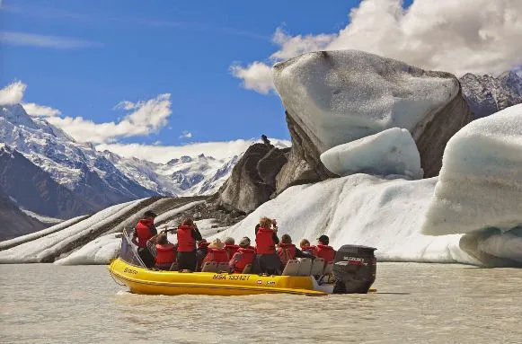 库克山顶峰终年被冰雪覆盖,群山谷地里的塔斯曼冰川(Tasman Glacier)长约27公里,平均宽度达2公里,厚度600米,景色壮观,是新西兰最长的冰河。有公路和徒步路线可以接近这条冰川。大巴将您带至塔斯曼山谷,30分钟徒步国家公园,穿过一路的冰堆石,登上专门制造的冰川游船MAC,欣赏变换不尽的景色,在安全距离内领略塔斯曼冰川千奇百怪形状各异的冰帽和冰峰,有机会去尝一尝有300-500年久远的冰晶。全称大约2.5个小时,其中包括45分钟至一个小时的冰川湖游览。