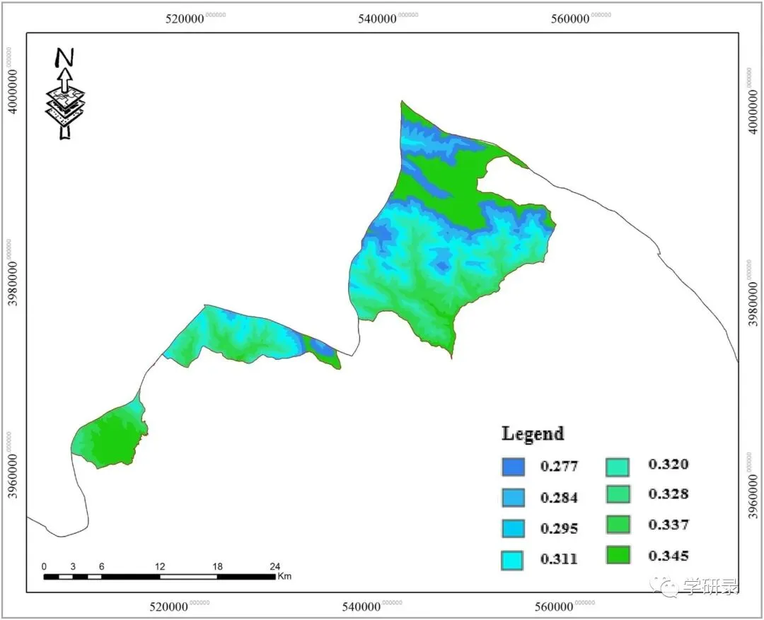 在CAP中,EES指标范围为0.277~0.345(图3)。研究区南部的EES最高,德黑兰和马赞达兰省边界附近的CAP北部和西部的EES最低(图3)。CAP北部和西部的EES值较低,南部和东部的EES值较高(图3)。安全区域主要分布在远离人类经济活动中心的南部和西部地区(图3)。