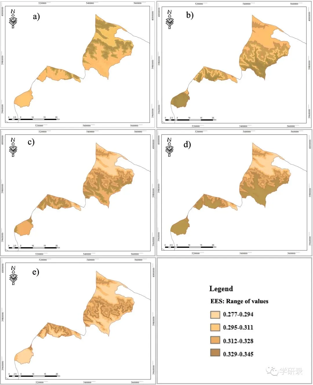 EES在CAP南部地区最大(图3),沿德黑兰省和马赞达兰省边界的补充保护区北部和西部的EES较低(图3)。该地区受到各种经济和有形活动的扩张、道路和高速公路的开发以及LULC变化的威胁。此外,EES指标分类结果表明,北部大部分地区(图3)被认为不安全,因此旅游开发的生态安全受到威胁。其他研究也报告了类似的发现,这些研究表明,已知的对EES的威胁包括砍伐森林、不可持续的农业实践、非法建筑、不负责任的旅游业和采矿业等活动。因此,评估EES及其脆弱性的有效指标对于监测EES的状况至关重要。