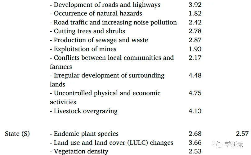 状态因子中,土地利用、土地利用的变化(LULC)变化得分最高(3.66),而生态系统结构和功能得分最低(1.54)。