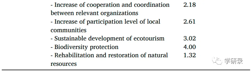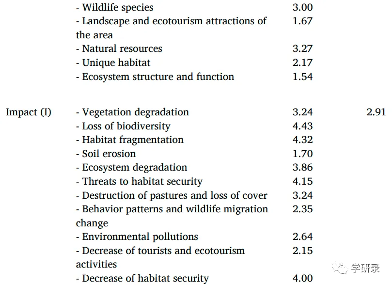 影响因子中,生物多样性丧失得分最高(4.43),健康水平下降得分最低(1.46)。最后,在应对因素方面,生物多样性保护的分值最高(4.00),而自然资源的恢复和复原的分值最低(1.32)。