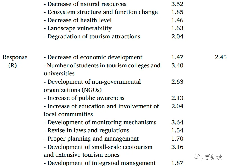 在旅游目的地,由于人类活动,生态安全风险增加,生态旅游发展的可持续性受到威胁。因此,生态旅游与环境的矛盾已成为旅游地亟待解决的现实问题。考虑到采用DPSIR框架的主要目的是构建信息结构,以便与决策者进行有效沟通,将“响应”定义为机构或实体为应对影响而采取的政策措施,这些影响直接或间接受到社会观念的影响。这种应对措施旨在抵消、缓解、补偿、减少或适应影响及其相关结果。反应因素中的有效指标值最大的是生物多样性保护(表2)。