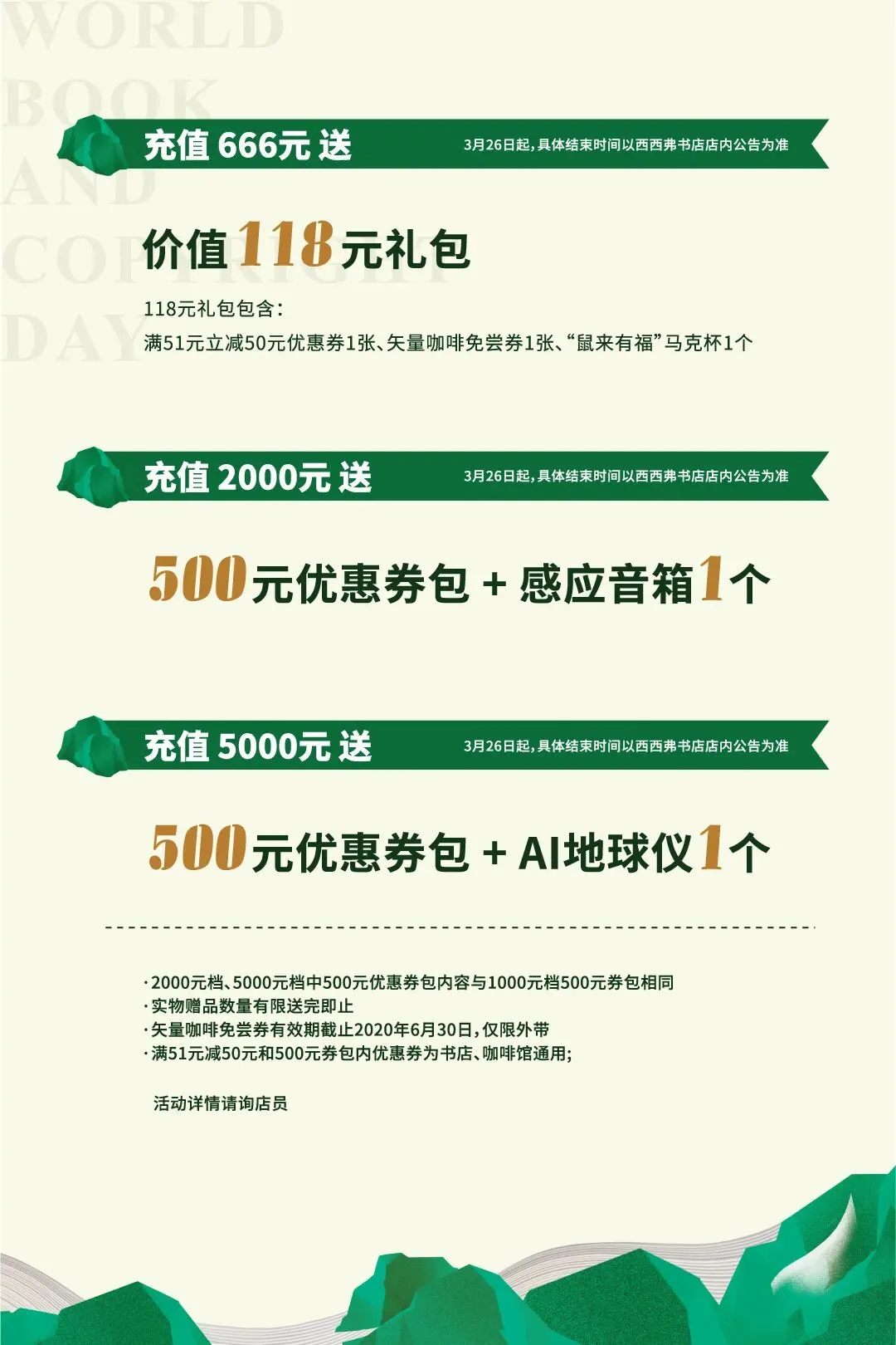 门店充卡活动也优惠多多,除了满1000送500的优惠礼包,不同充值档位还有好礼以及咖啡免尝券等超值馈赠,这个假期,我们以阅读来把握。