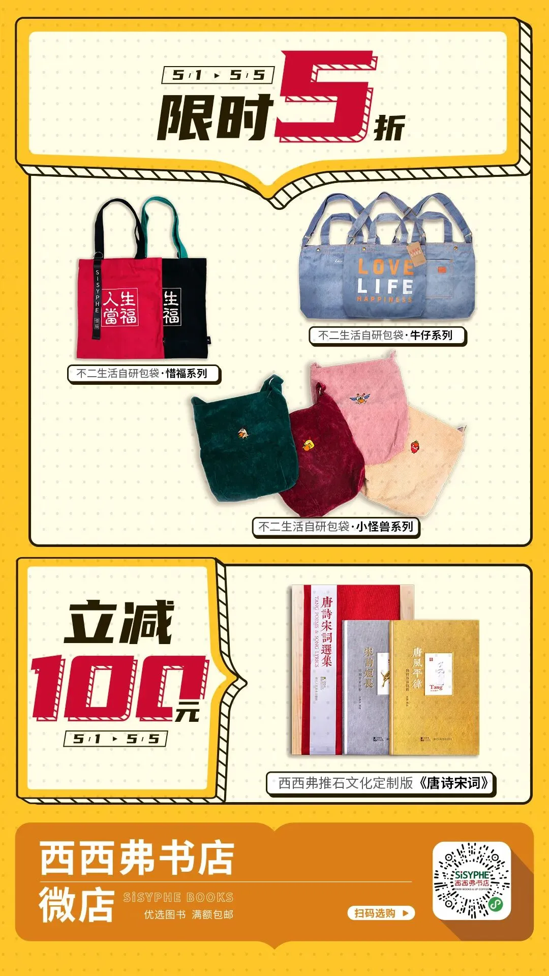 图书方面,选以西西弗定制书《唐诗宋词选集》,原价立减100元,以国风诗画唤醒生活之美,让传统诗词文化回归生活;五一期间,适合收藏,更适合赠礼。