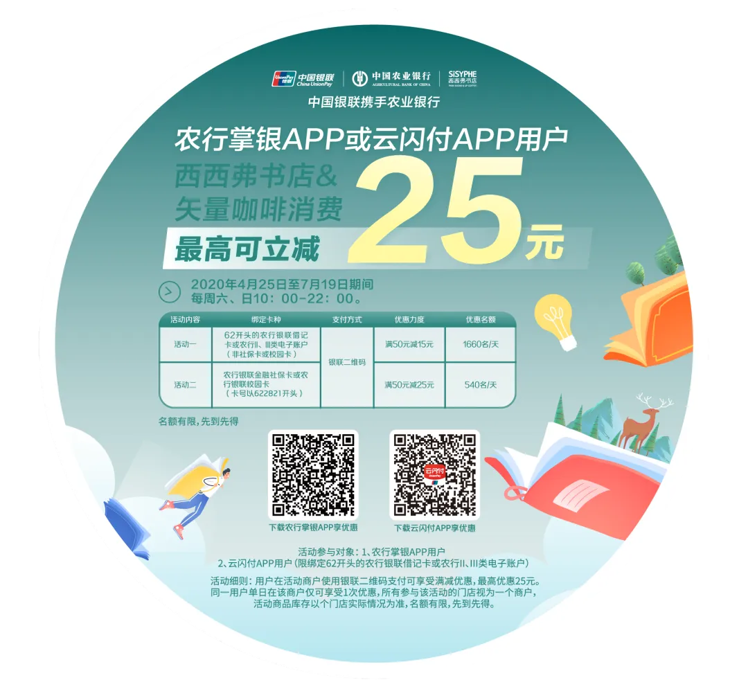 活动一:书店及矢量咖啡,用户在活动期间使用农行掌银APP或云闪付APP绑定62开头的农行银联借记卡或农行II、III类电子账户(非社保卡或校园卡),出示银联二维码进行支付,可享消费满50元减15元优惠。每日优惠名额1660名,先到先得,用完即止。