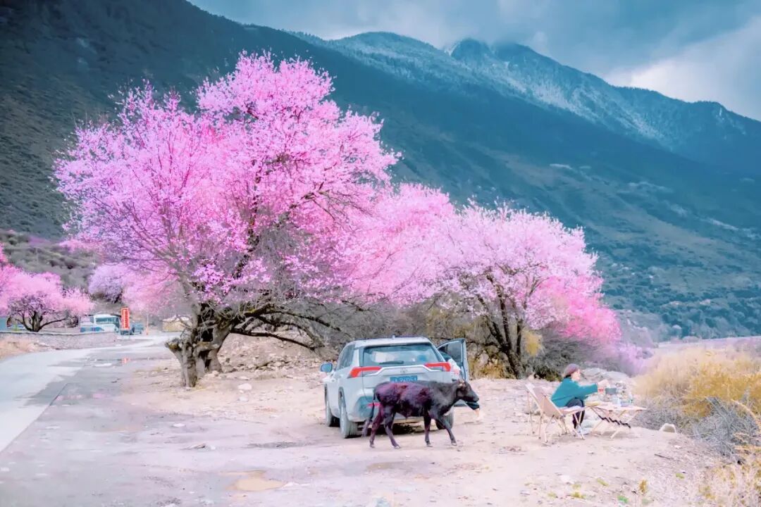 远处是雪峰。近处是粉色花海。中间是藏式村落和牦牛慢慢走——画面层次直接拉满。