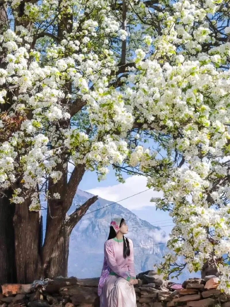 梨花像云一样压下来,藏寨点缀其中,河水在脚下绕弯。风一吹,花瓣飘——那种纯净感,很少见。