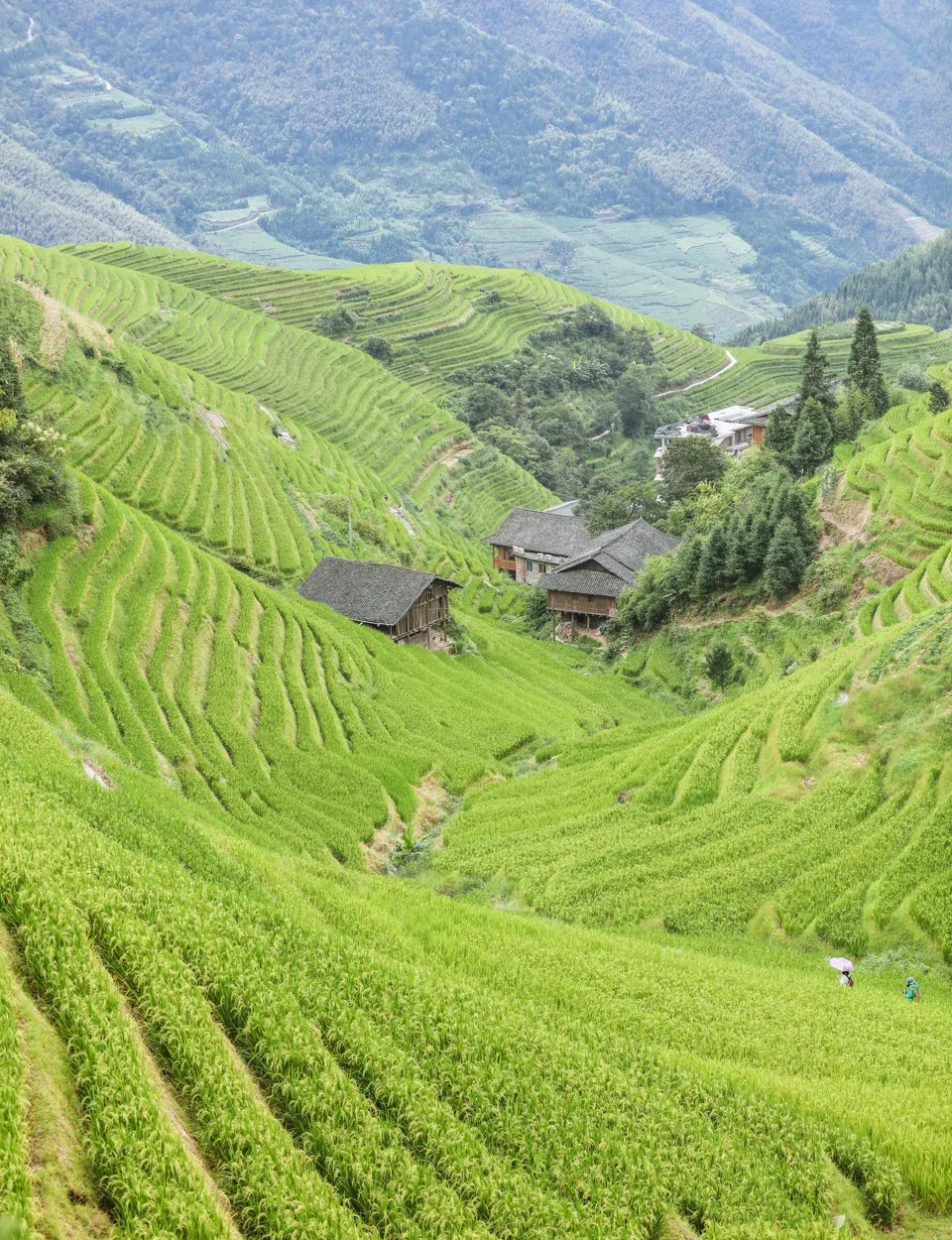 山坡一层层铺满金黄,徽派白墙黑瓦嵌在中间,清晨有雾的时候——像水墨忽然上色。