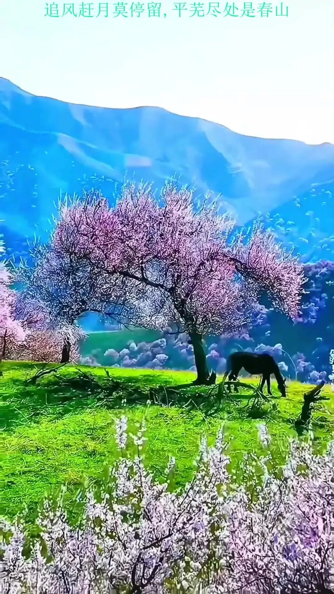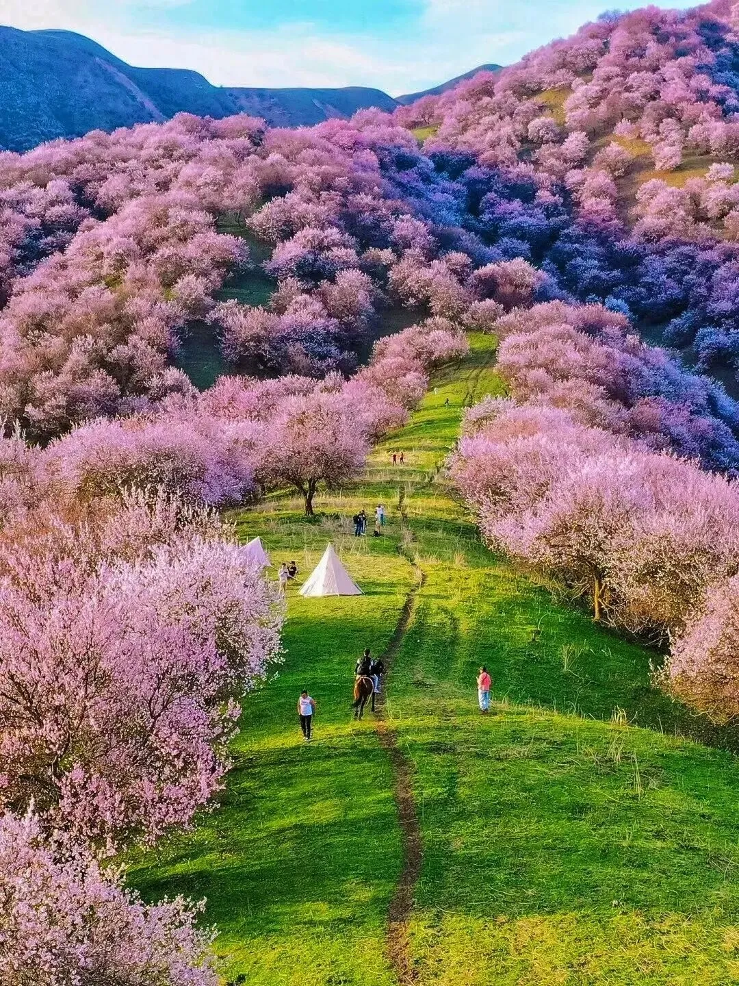 野杏林铺在起伏山坡上,远处是雪山,近处是牛羊。辽阔感直接拉满——心会突然变得很轻。